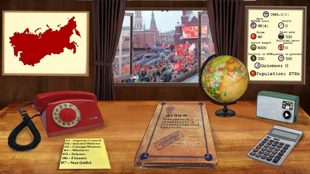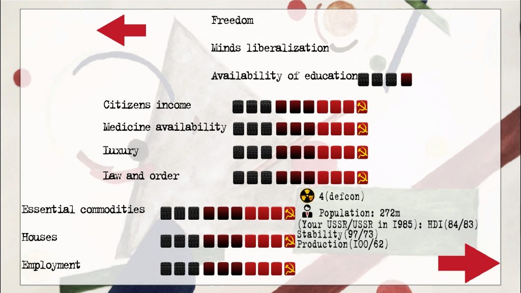 İşte tam olarak da burada oyunun en büyük hataları ortaya çıkmaya başlıyor. Elinizde elbette belli başlı veriler var fakat bu verilerin etki alanlarını görmek ya da bilimsel ya da siyasi gelişmelerle yaşanan verilerdeki değişimin tam olarak oyundaki ve saydığım çok sayıdaki taraf üzerindeki etkisini görmek oyunun içinde mümkün değil. İstatistik ekranı oldukça soyut ve bir önceki ayda gerçekleşen hangi değişimlerin bu ay hangi değişimlere sebep olduğunu göstermiyor. Oyuncular bu sorunun üstesinden gelmek için oyun dosyalarını kurcalamış fakat bu bile gülünç, temel bir dizayn prensibi olarak oyuncu hiçbir zaman yaptığı eylemlerin sonucunu anlamak için oyunun dosyalarını çeşitli yollarla manipüle etmek zorunda olmamalı. Bu oyunun bütün oynanabilirliğini temelden etkiliyor çünkü atadığınız bakanların, değiştirdiğiniz politikaların, geliştirdiğiniz teknolojilerin sonucu hep muğlak kalıyor. Bir başka sorun ise başarılı olmak için uygulanabilecek stratejilerin oldukça kısıtlı olması. İnternetteki yorumlara da baktığımızda bu kadar çok çeşitli gelişmenin olduğu oyundaki stratejiler sadece iki üç ana yola ayrılmış ve bu stratejilerin dışına çıkmak kesin bir başarısızlığı getiriyor. Bu yüzden oyunun ilk başta oldukça etkileyici olan derinliği hızla sığlaşıyor ve sadece istenen oyun sonunu elde etmek için basılan belli butonlara dönüştürüyor oyunu. İstatistiklerin muğlaklığıyla oyunun derinliğinin yarattığı çelişkinin üstüne bir de oyundaki stratejilerin kesin hatlarla belirlenmiş olması oyunu gereğinden fazla zorlaştırıyor. Türün daha bilinen bir oyunu ile kıyaslama yapmak gerekirse Crisis in the Kremlin’in en kolay zorluk seviyesi neredeyse Democracy 3’ün en zor seviyelerine denk. Maalesef bu zorluğun sonucu olan başarısızlık ise yenildikçe hırslandırıp daha iyi yapmayı arzulatan bir zorluk değil, belli bir yola girip oyunu sınırlı kurallarına göre oynamaya mecbur bırakan bir zorluk. Üstüne üstlük oyunun en temel mekaniği olan, başlı başına zamanın geçişini temsil eden dönemlik olaylarda ilk beş sene sonrasında giderek azalmayı ve tekrar tekrar aynı olayları görmek de mümkün. Diğer ülkelerle ilişkiler de aynı sorundan mustarip. Örneğin Hindistan gibi soğuk savaş döneminde üçüncü cepheyi temsil eden önemli bir ülke ile girebileceğiniz tek kayda değer etkileşim silah yardımı ve Kaşmir Savaşı’nı başlatması. Bu kısmı oldukça zevkli olsa da Kaşmir Savaşı’nı Hindistan kazanırsa geriye kalan tek etkileşim COMECON’a davet etmek. Eğer kaybederlerse başka bir etkileşim bulunmuyor. Hindistan, KDHC (Kuzey Kore) gibi kısıtlı fakat ilgi çekici etkileşime sahip ülkelerin tam karşıtı olarak Afrika’da sürekli devrimlerle taraf değiştirtilebilen jenerik ülkelerin varlığı da bu soruna iyi bir çözüm sunmuyor, sadece haritayı kızıla boyama işlevi görüyor (fena da değilmiş sanki). Son olarak, zaman zaman oyunun İngilizce çevirisinde yaşanan sorunlar belli başlı konuları anlamayı güçleştirebiliyor.